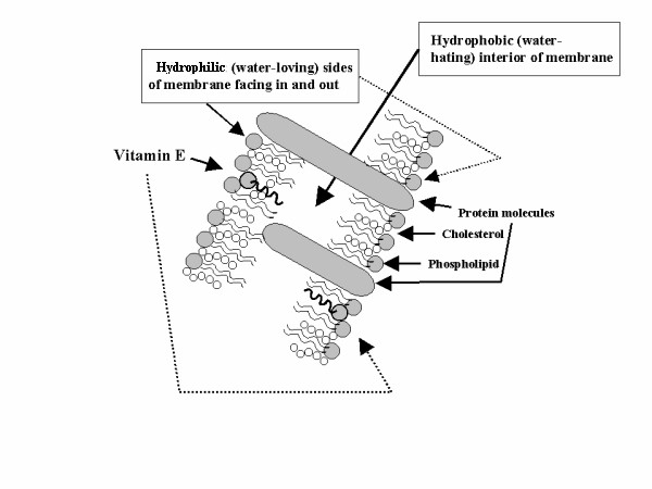 Vitamin E places its "head" in the hydrophilic (water loving) sides of a cell membrane that face both in and out. Vitamin E’s "tail" extends into the hydrophobic (water hating) interior of the cell’s membrane. This gives vitamin E an excellent position from which to fight free radicals. With its head in the sides of the cell membrane and its tail in the interior of the membrane, it is similar to a soldier fighting in a bunker while being protected from the entire enemy’s firing. Vitamin E breaks the chain reaction of oxidation of fat and protects all our cell membranes, including those around our DNA.